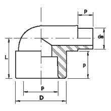 | Código:8092090025 | Descrição:Cotovelo Normal de 90º MF 25mm | Peso (gr)23 | p (mm)18 | L (mm)31 | d-de (mm)25 | D (mm)34 |